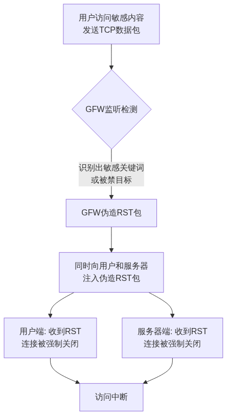 GFW通过发送伪造的TCP重置包(RST)中断HTTP连接,特别针对80端口的明文流量。当HTTP请求头(如Host: www.google.com )包含敏感关键词时,GFW向通信双方注入RST包,迫使连接终止。